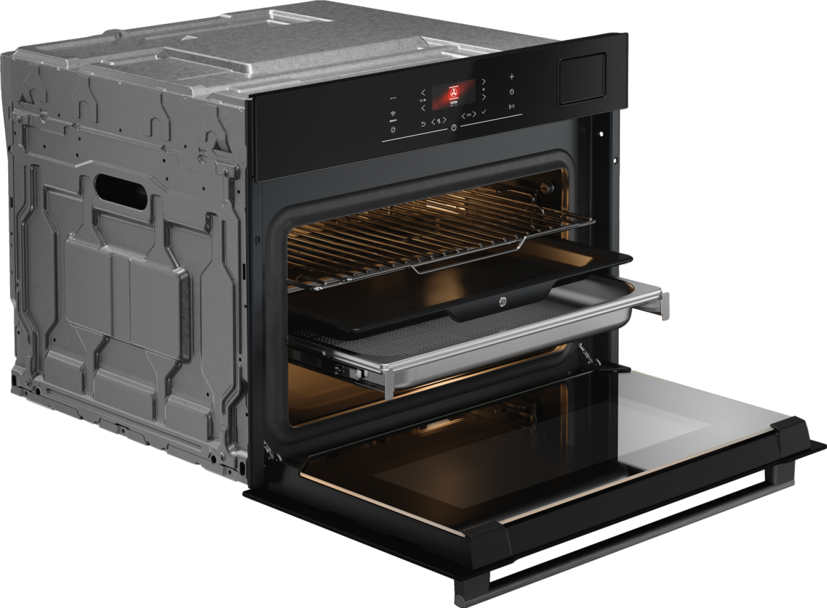 В комплект входят универсальный противень, решётка, два противня из нержавеющей стали (перфорированный и цельный) и термозонд для точного контроля внутренней температуры блюд. Двустороннее галогеновое освещение позволяет наблюдать за процессом приготовления без открытия дверцы.