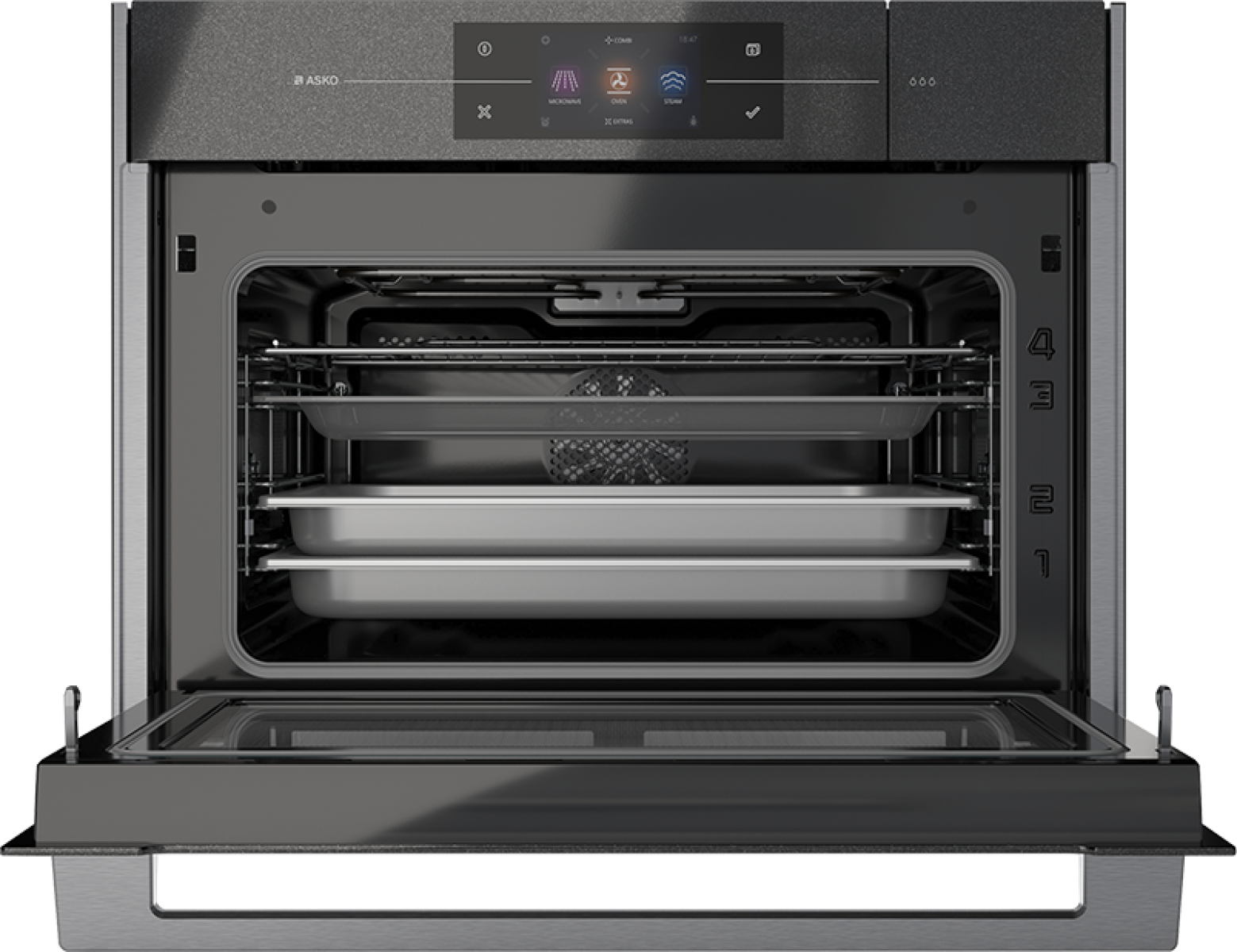 Компактный духовой шкаф Asko OCSM8478G — одно из самых технологичных и многофункциональных решений в ассортименте бренда. В одном корпусе объединены классическая духовка, микроволновая печь и пароварка, дополненные грилем и конвекцией. Такой формат «3-в-1» позволяет использовать каждый режим отдельно или комбинировать их в многоэтапных сценариях приготовления, добиваясь профессионального результата даже в сложных блюдах.