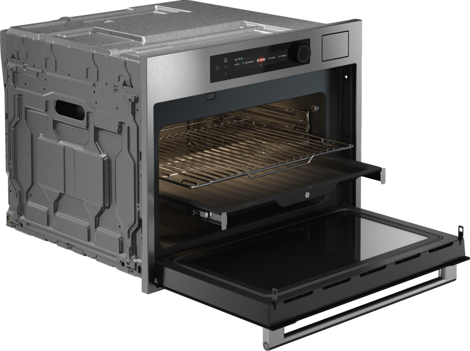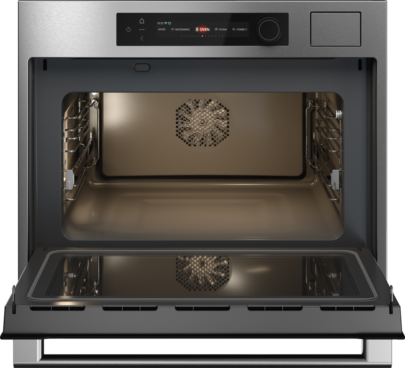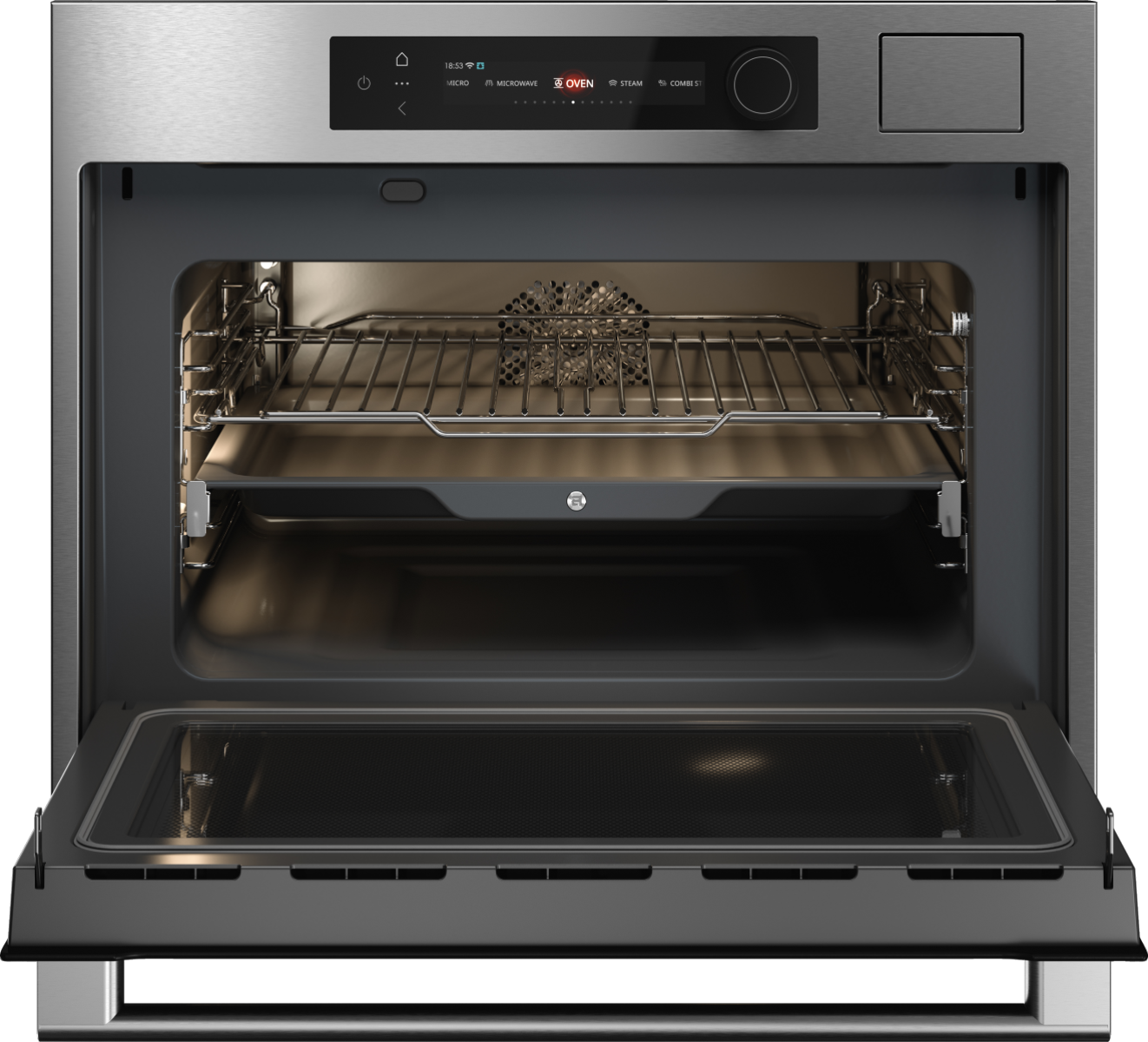 Печь предлагает 20 режимов нагрева, 4 программы с паром и 4 режима СВЧ, включая комбинированные режимы с микроволнами и паром. Такое сочетание позволяет готовить блюда с сочной текстурой внутри, румяной поверхностью и точным контролем результата — от разогрева до сложных рецептов.
