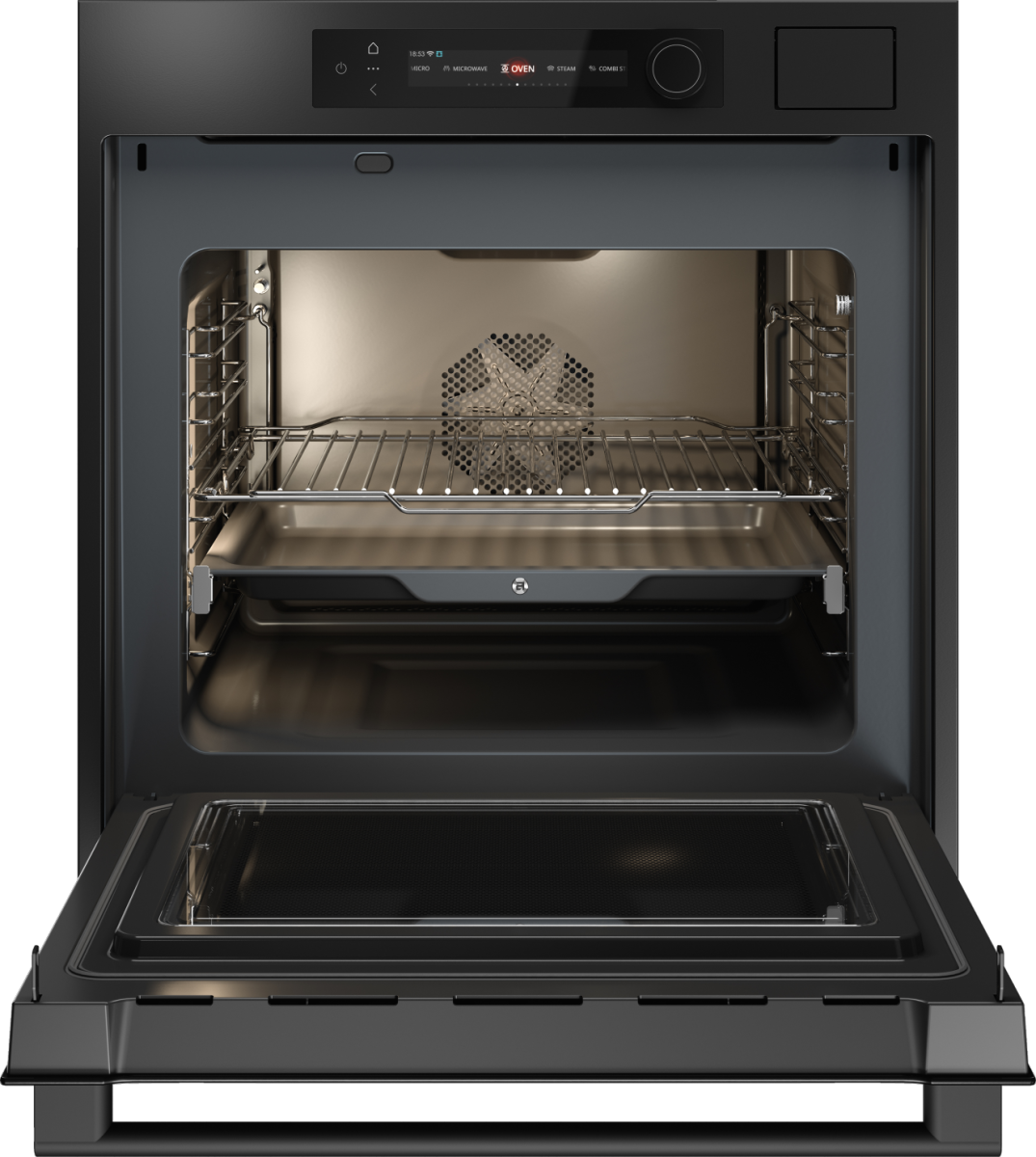 Управление сосредоточено вокруг 6-дюймового TFT-дисплея с сенсорными зонами и поворотным энкодером: интерфейс нагляден и интуитивен. В памяти — 129 автоматических программ, а термозонд позволяет готовить по внутренней температуре, не открывая дверцу и не нарушая тепловой режим. Эргономика продумана до мелочей: телескопические направляющие на одном уровне, плавное и безопасное закрывание, тройное остекление дверцы и LED-подсветка с регулировкой яркости и цветовой температуры для точного контроля степени подрумянивания.