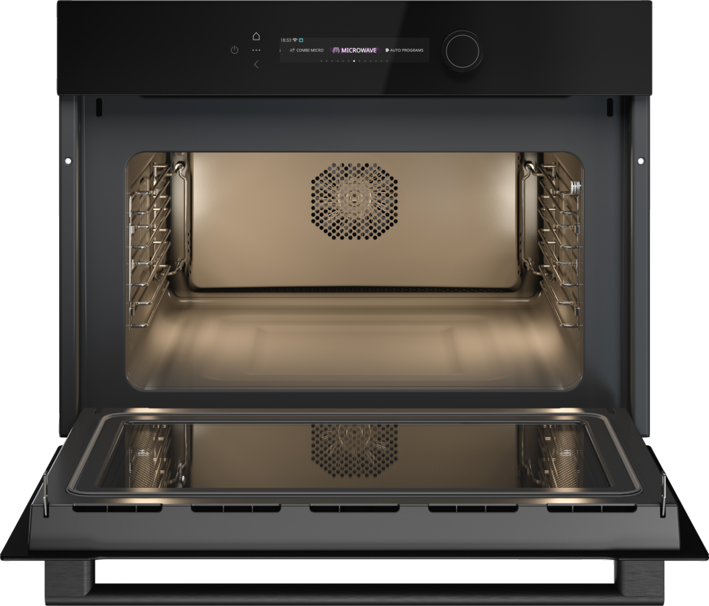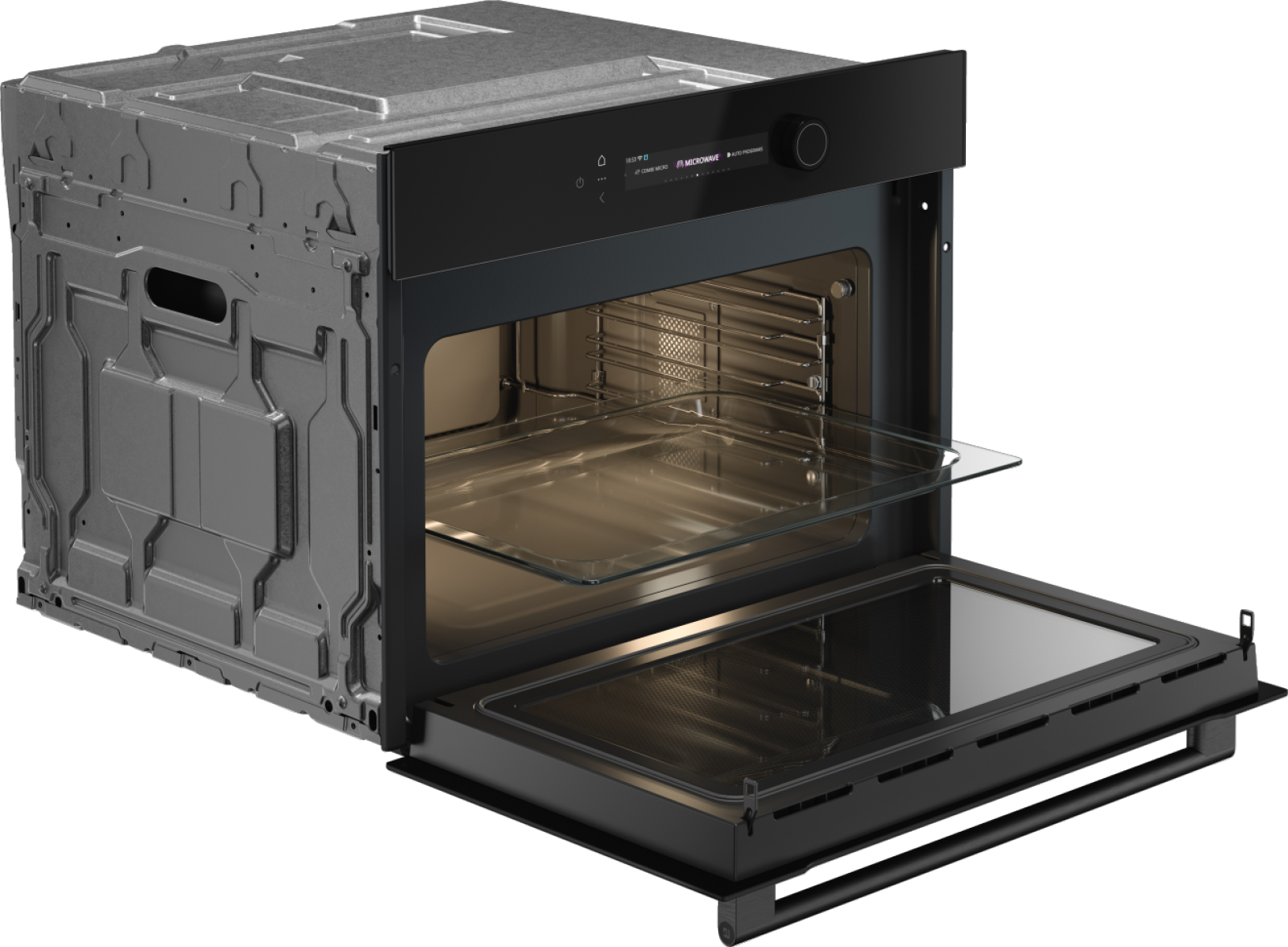 Безопасность эксплуатации продумана до мелочей: дверца с тройным остеклением и внутренним охлаждением остаётся прохладной снаружи, снижая риск ожогов. Плавный механизм открывания и закрывания повышает комфорт, а равномерное внутреннее освещение позволяет наблюдать за блюдом без необходимости открывать дверцу.
