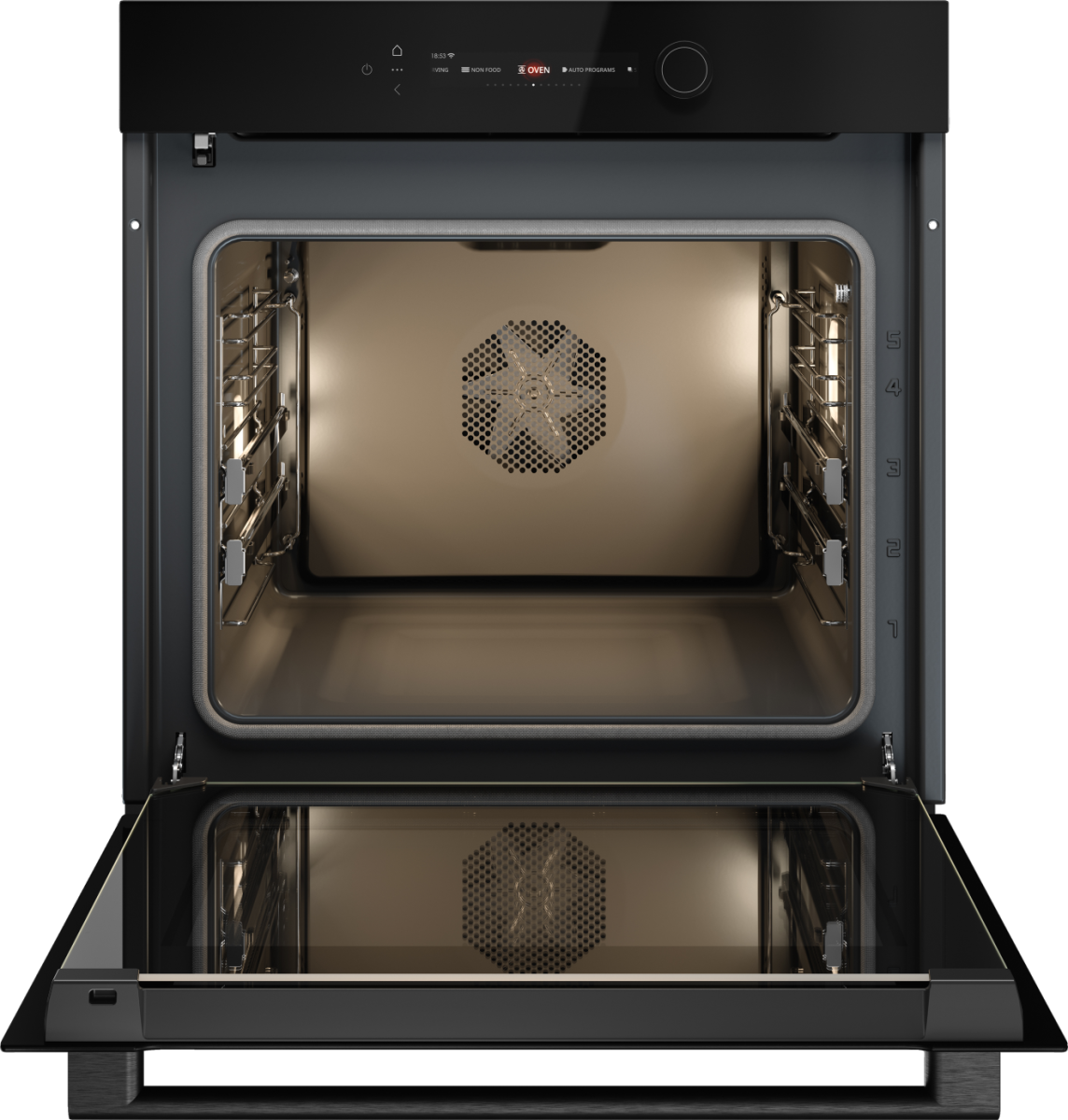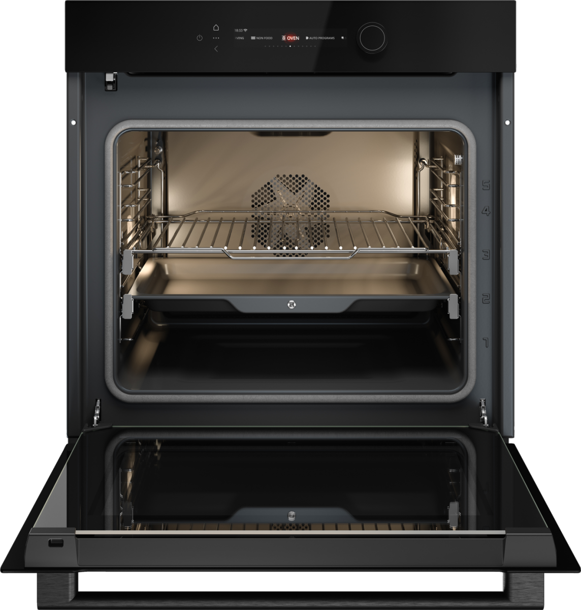 Комфорт эксплуатации продуман до мелочей: дверца с плавным открыванием и закрыванием, трёхслойное остекление для снижения нагрева внешней поверхности, двустороннее галогеновое освещение для полного обзора камеры. Внутреннее покрытие из пиролитической эмали устойчиво к загрязнениям и упрощает уход, а функции Aqua-очистки и частичной самоочистки позволяют поддерживать чистоту без агрессивных средств.