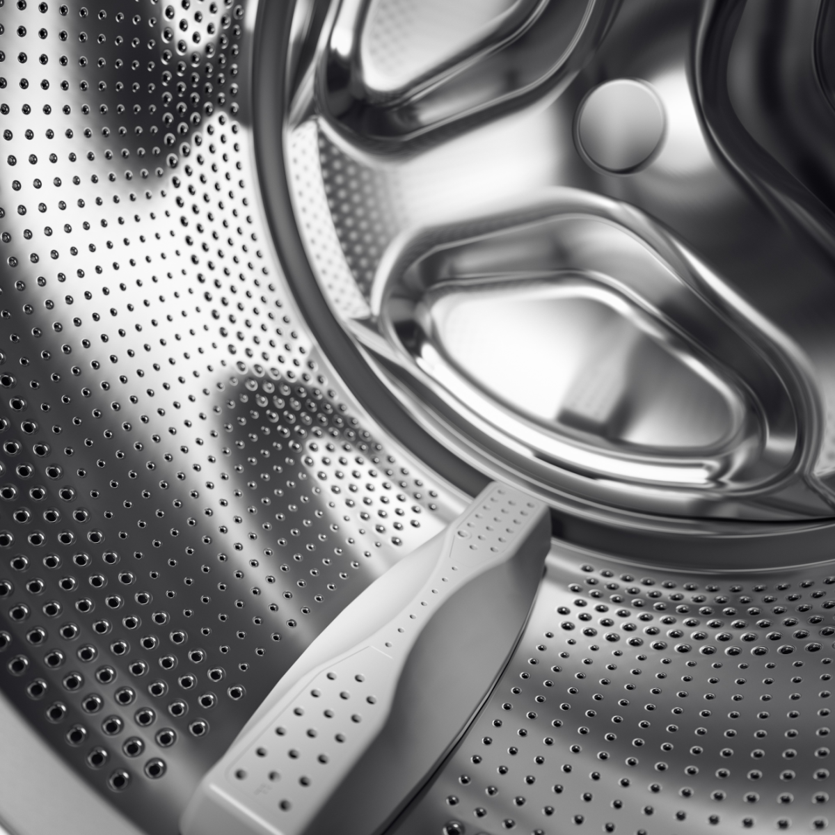 Дверца с технологией Steel Seal выполнена без резиновой манжеты, что повышает гигиеничность, исключает скопление влаги и загрязнений и увеличивает полезный объём загрузки до 9 кг. Машина поддерживает подключение к горячей воде, что ускоряет циклы и снижает энергозатраты, а также совместима с автоматическими системами дозирования моющих средств.